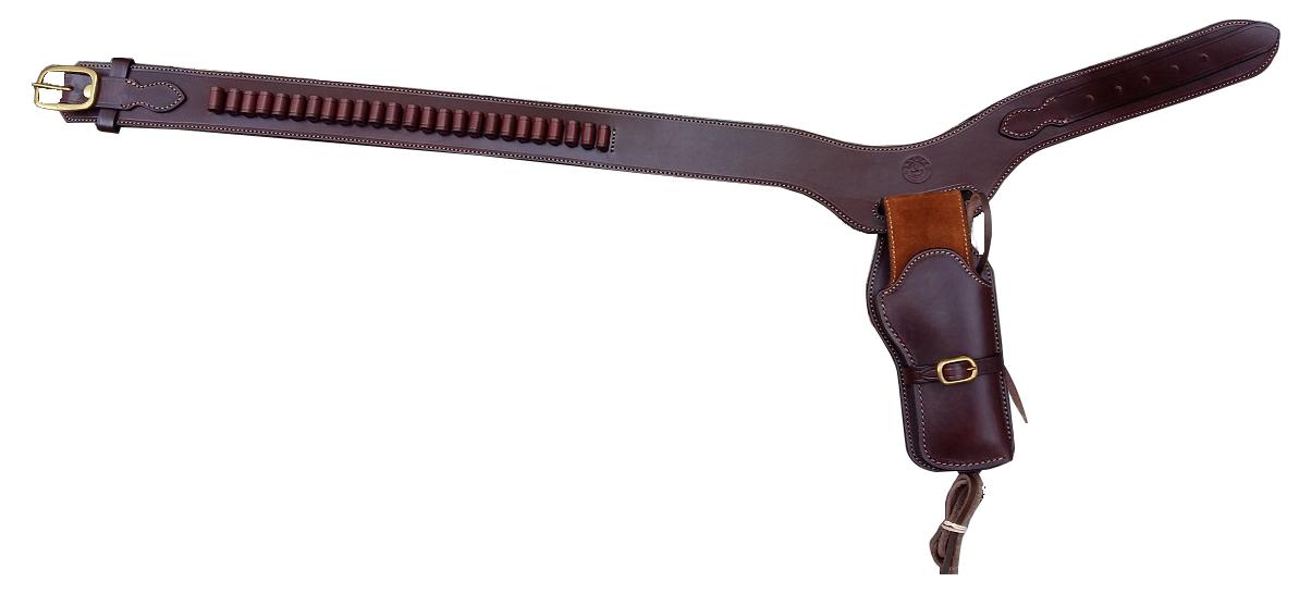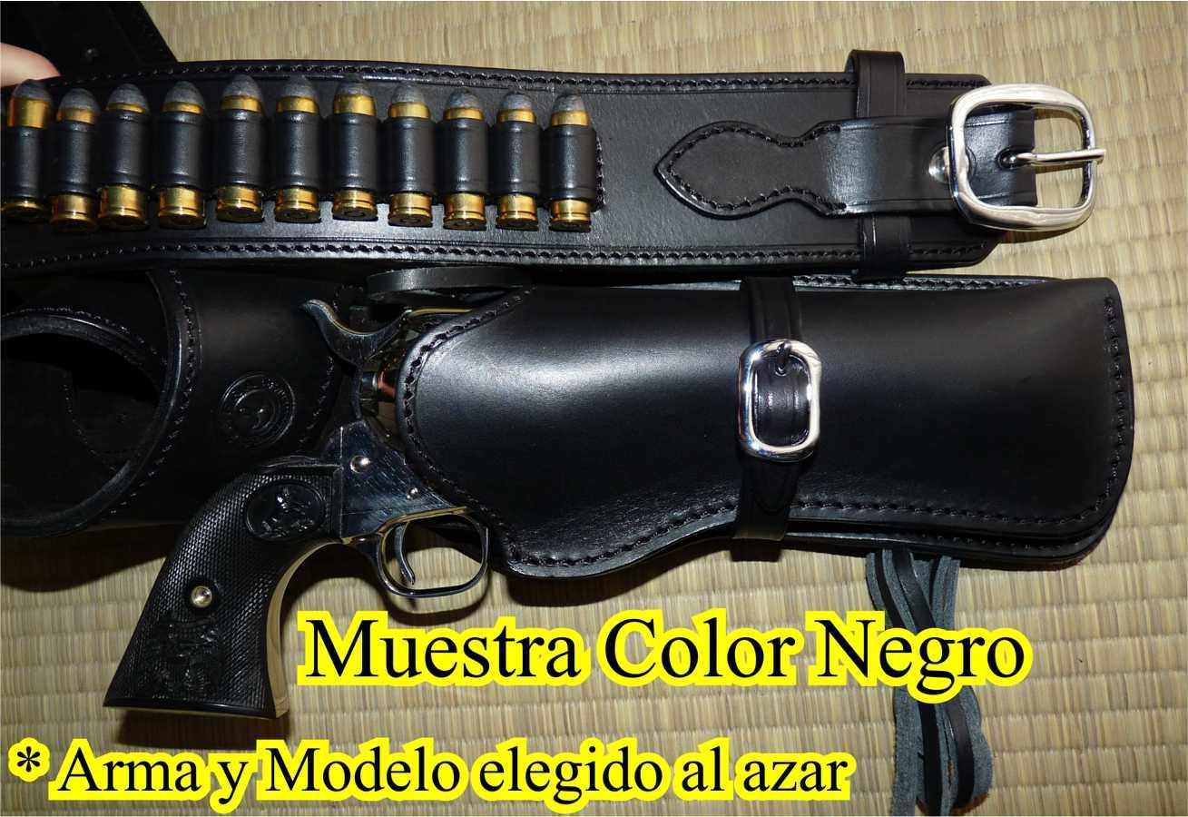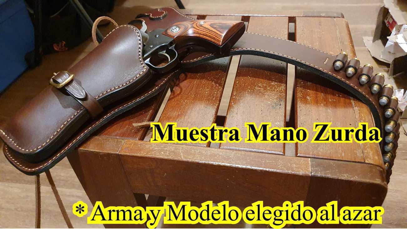 Este conjunto de cinturon y funda tiene el estilo de los usados en el oeste Norteamericano.El cinto con una leve caida hacia el sector donde se inserta la funda, contiene ademas 25 alojamientos para balas moldeados a mano.