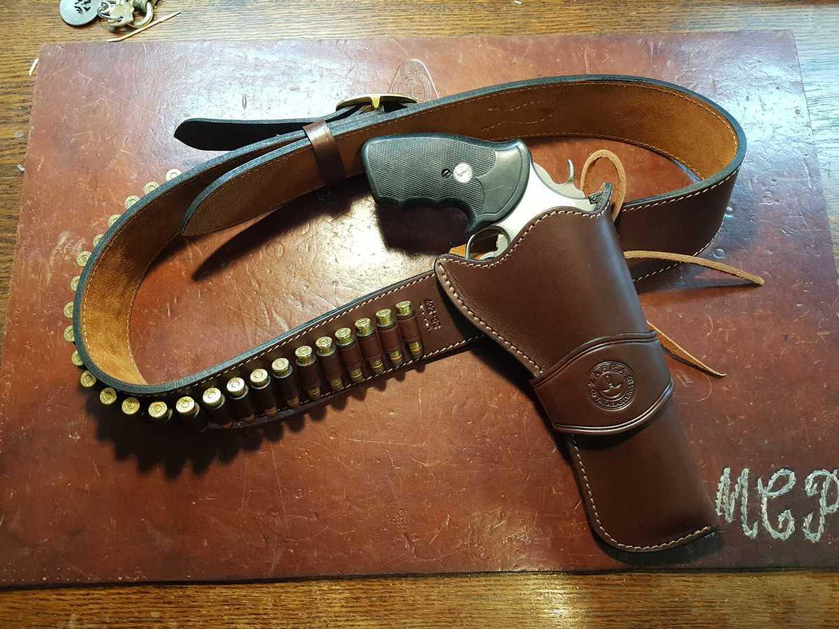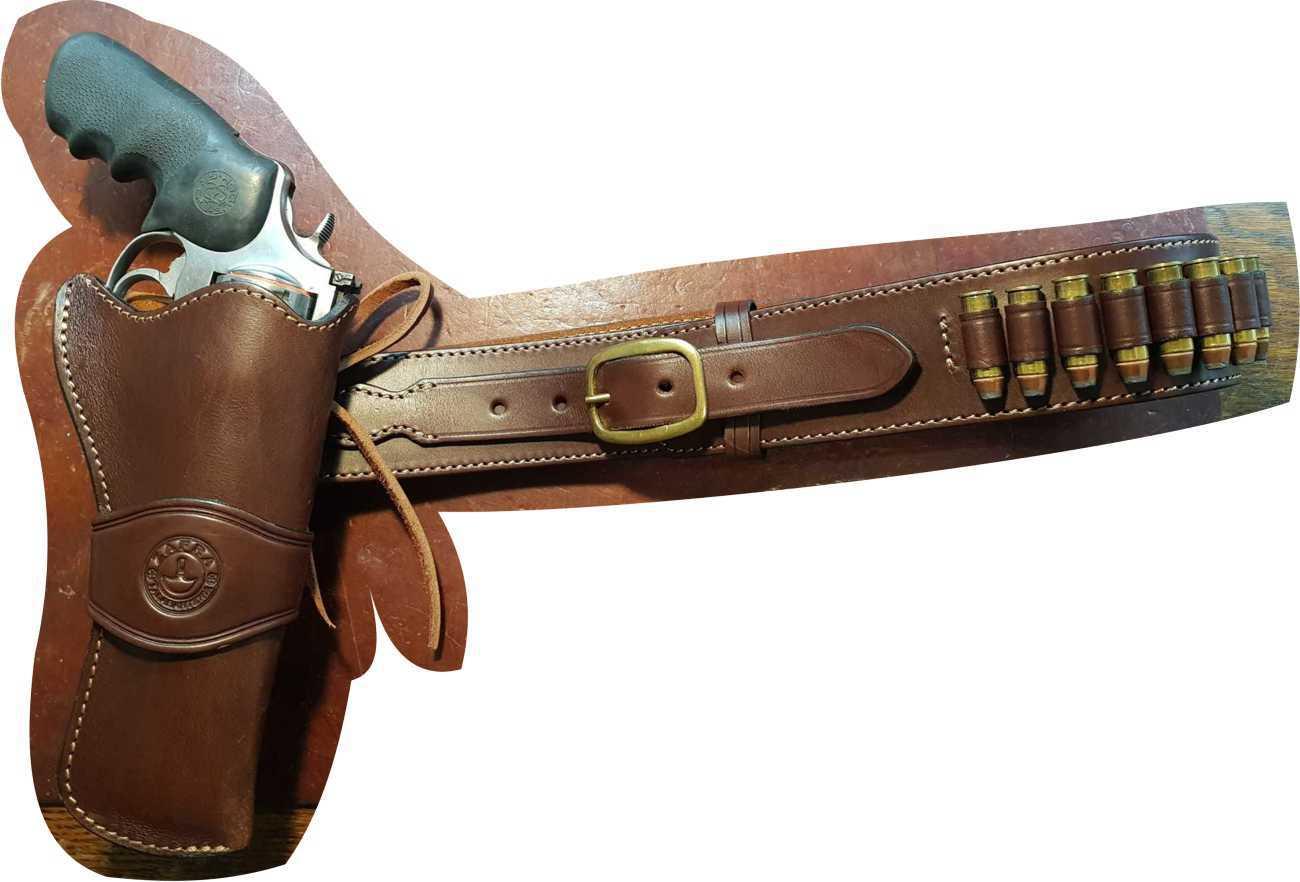 El cinto es recto y aloja 25 municiones moldeadas a mano. A pedido se pueden grabar iniciales y logos en el frente de la. pistolera. Conjunto de cinturon y funda que tambien pueden adquirirse por separado.