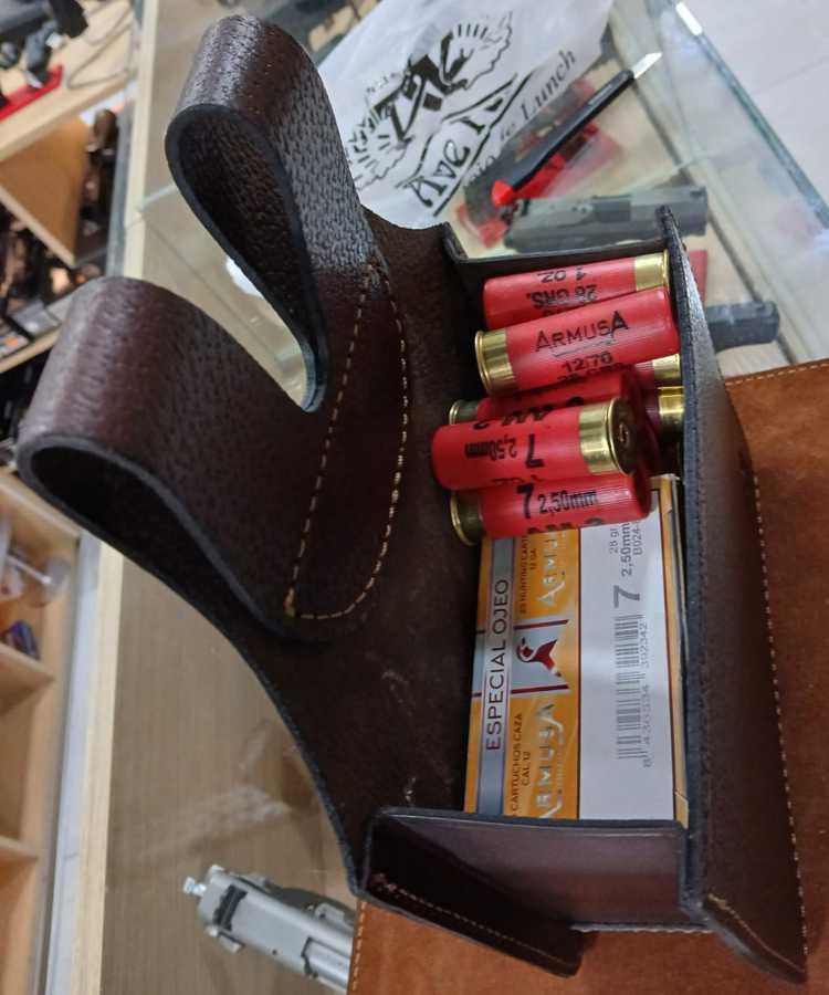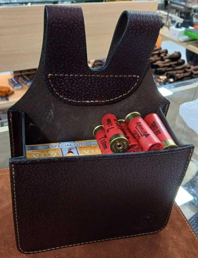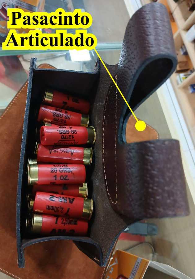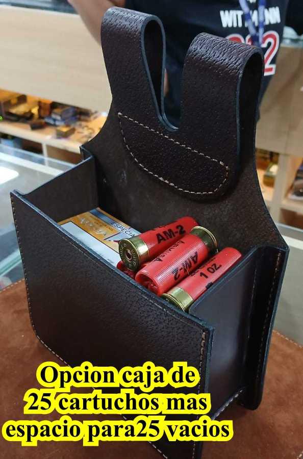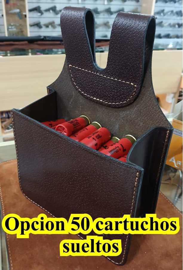 Se usa en la cintura. Para ronda de tiro al plato o cacerias rapidas. Capacidad 50 cartuchos sueltos del 12 o 16 o 25. Pueden ir 25 en caja de carton y hasta 25 cartuchos servidos, a su alrederor.