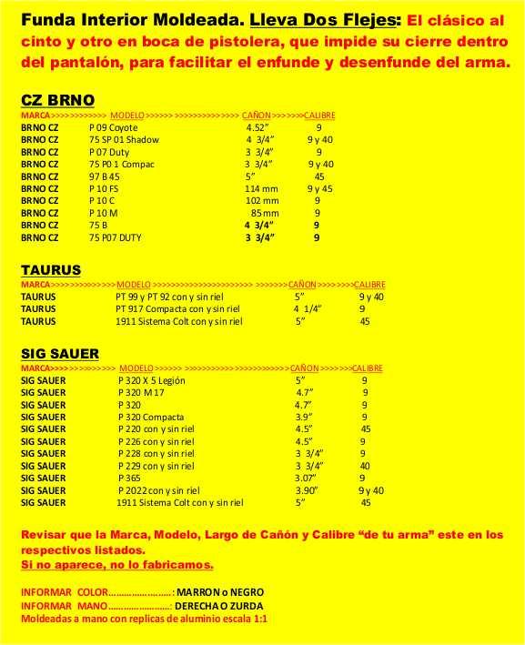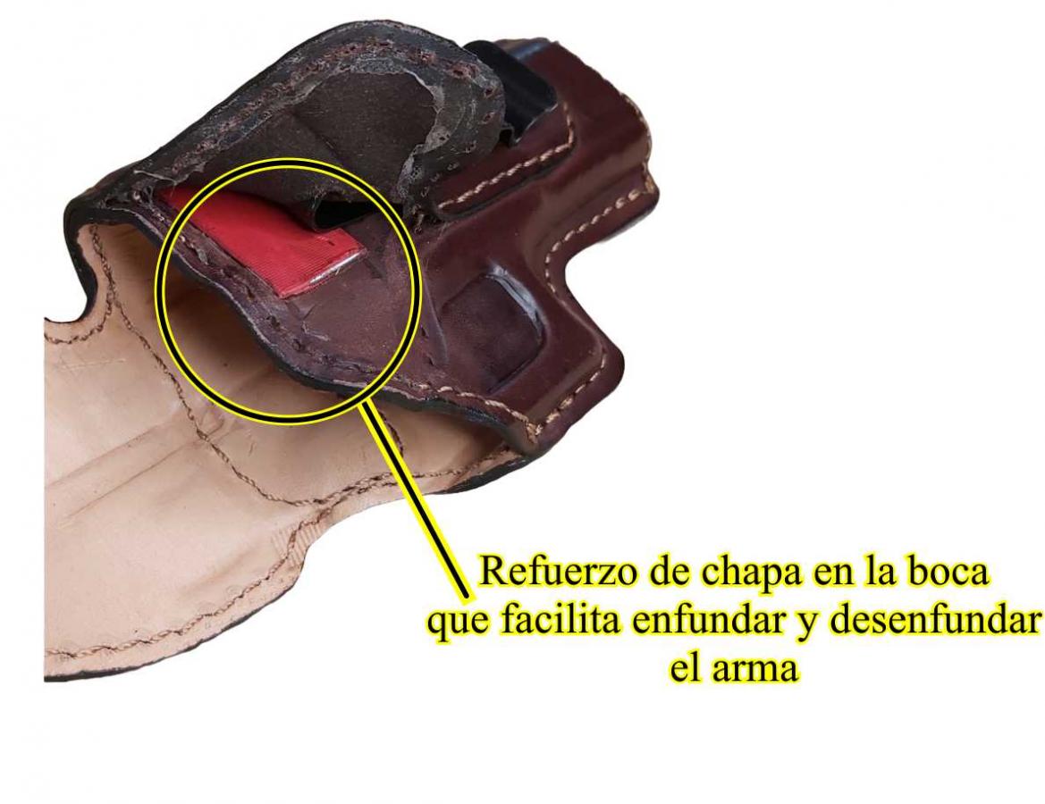 * FLEJE DOS : En boca de pistolera, impide que la funda se aplaste dentro del pantalón al desenfundar el arma, a la vez que facilita el enfunde.