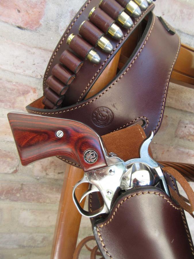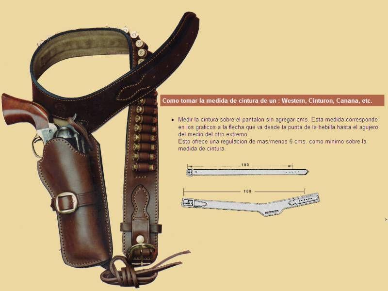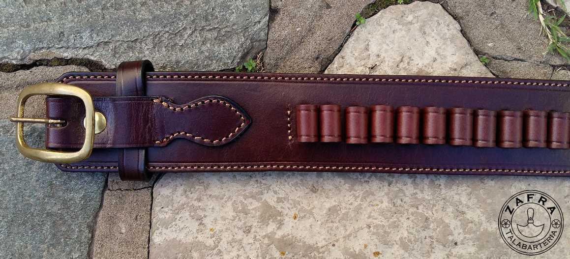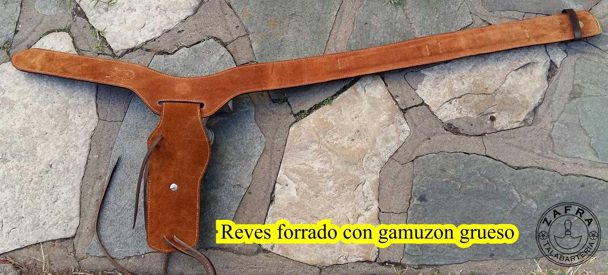 Este conjunto de cinturon y funda tiene el estilo de los usados en el oeste Norteamericano.El cinto con una leve caida hacia el sector donde se inserta la funda, contiene ademas 25 alojamientos para balas moldeados a mano.