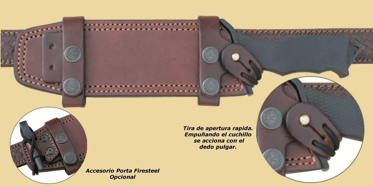 Esta diseñada sobre cuchillos tacticos, militares, bowies o similares, para supervivencia, campamentismo extremo, partidas de caceria o otras actividades.