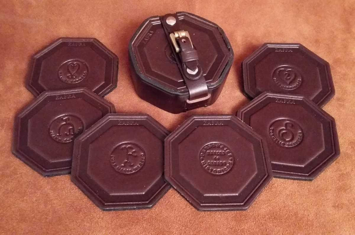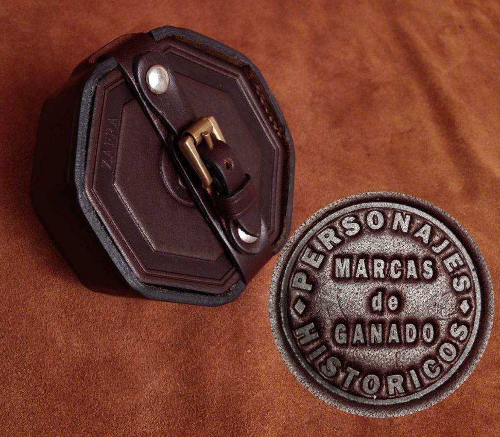 Construidos en cuero curtido vegetal,con forma octogonal de aproximadamente 9 cms.