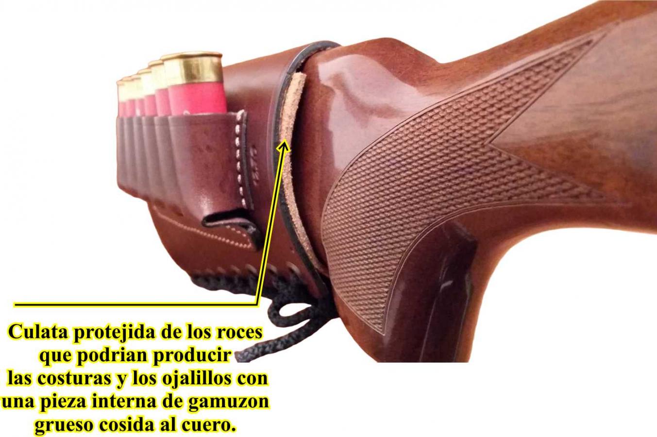 Construida en cuero de 3,5 milimetros de espesor , aloja hasta seis cartuchos para todos los calibres de escopetas disponibles.