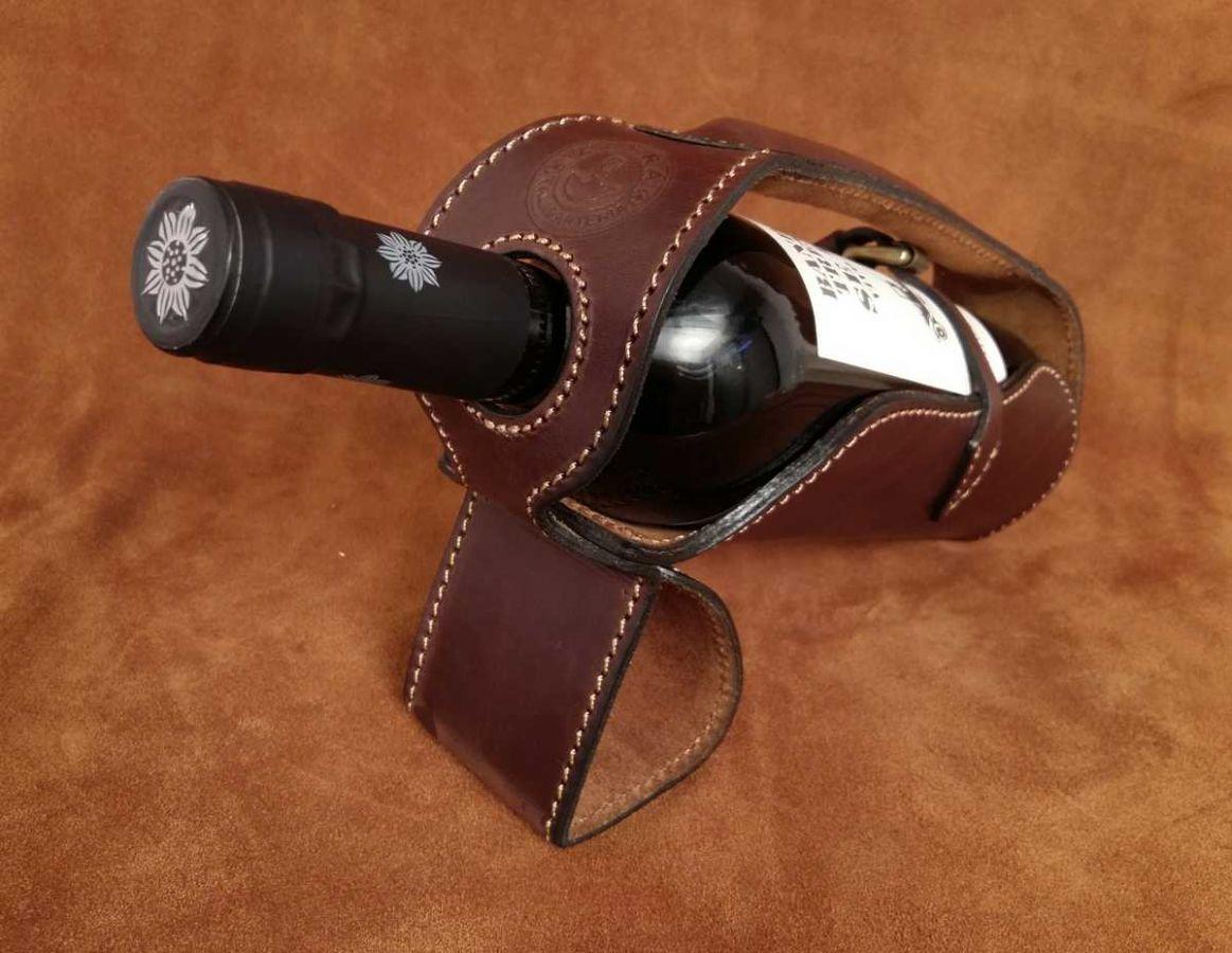 La botella se sujeta con un mini cinturón con hebilla de bronce macizo.